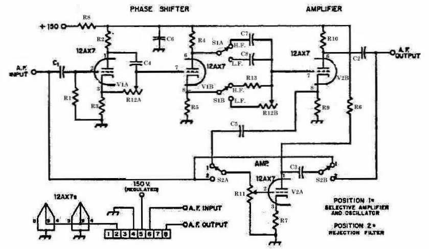 The Selectoject is a receiver adjunct that can be used as a sharp amplifier or as a single-frequency rejection filter. The frequency of operation may be set to any point in the audio range by turning a single knob. The degree of selectivity (or depth of the null) is continuously adjustable and is independent of tuning. In phone work, the rejection notch can be used to reduce or eliminate a heterodyne. In C.W. reception, interfering signals may be rejected or, alternatively, the desired signal may be picked out and amplified. The Selectoject may also be operated as a low-distortion variable-frequency audio oscillator suitable for amplifier frequency-response measurements, modulation tests, and the like, by advancing the "selectivity" control far enough in the selective-amplifier condition. The Selectoject is connected in a receiver between the detector and the first audio stage. Its power requirements are 4 ma. at 150 volts and 6.3 volts at 0.6 ampere. For proper operation, the 150 volts should be obtained from across a VR-150 or from a supply with an output capacity of at least 20 mf. The wiring diagram of the Selectoject is shown in Fig. 5-45.Resistors R2 and R3, and R4 and R5, can be within 10 percent of the nominal value but they should be as close to each other as possible. An ohmmeter is quite satisfactory for |