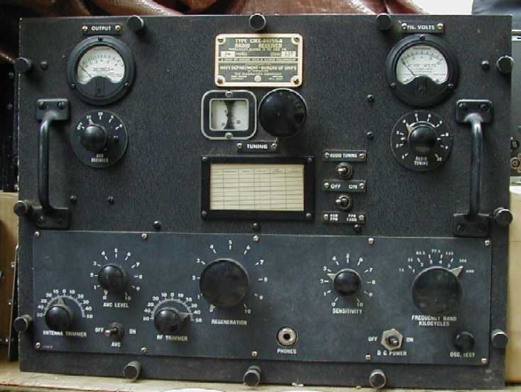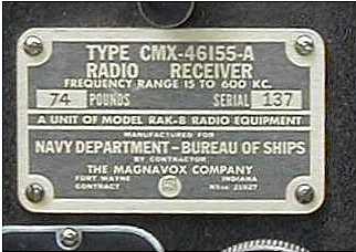 This sweetheart is the RCA designed RAK-8, a VLF TRF design with 6 tubes in a 20" near-cube weighing 74 lbs. It covers 15 to 600 Khz in 6 bands and has a 20 step sharp audio band-pass filter covering 440 to 1500 Hz. The tubes are the older 6 pin types, with 6D6s (equivalent to the 6SK7) as 1st and 2nd RF amps, and regenerative detector, and type 41s (equivalent to the 6K6) as the audio limiter and audio output amp. This receiver is very extensively shielded and filtered to prevent nearby transmitters from getting into it, and is very sensitive and selective. There is no audio gain control, the audio stage runs wide open. RF selectivity is such that the operator enjoys "single-signal" reception over its entire range. I.e., only one side of zero beat ever appears. This selectivity is arrived at by the very careful design and construction of the RF amp input and output coils only. The frequency readout is typical of the era, the early 1930s, that is, non-existent. The dial reads in 0 -100 and 0-10 and one must use a chart to tell what frequency you are on. Power requirements are extremely modest: 180 VDC at 45 mA, regulated 90 VDC at 1 mA, and 6.3 VAC or DC at 2.0 amps, yet the power supply is huge, weighing 65 lbs! Below is a blowup of the front panel nomenclature tag.