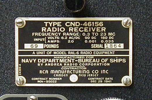 This is the RAL-6, also designed by, and in this particular one, built by RCA. It is nearly identical to the RAK with the exception of its frequency range which is from 300 Khz through 23 Mhz, an added "Frequency Vernier", and an Audio Broad/Sharp switch. Power requirements and size are identical, and weight is a little less than the RAK. I used an RAL-7 for many years as my main station receiver and thoroughly enjoyed its sensitivity, selectivity, and marvelous stability. I have another one now and really enjoy using it. There is a certain sense of "transparency" when listening to signals on the air with it. This particular RAL-6 originally was used on the US Navy Fleet Submarine, the USS Pintado at one time, and its meters, in this photo, are not original. They were replaced with original meters when the receiver was restored and now it is being used by a fellow regen user in Tennesee. Below is its nomenclature plate.