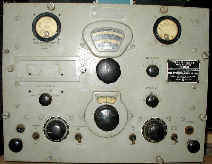 This very dirty behemoth is the RCA designed and built RBA VLF receiver, and is awaiting restoration. This receiver is extremely well shielded, and is a TRF design with a twist. 3 RF amplifier stages, the third of which is operated at very low plate and screen voltages, 15 VDC, so that it acts as a limiter, followed by a triode plate-detector which is also fed a signal from a separate tuned heterodyne oscillator or BFO, then another fairly complex limiter stage, and two stages of audio amplification with extensive audio filtering. The audio output stage is configured such that one can connect from one pair to 20 pairs of headphones (why on earth would you do that?) with no change in output amplitude. It looks a lot like the companion RBB and RBC receivers, and can use their same power supply. This hulking receiver weighs over 90 lbs and is considered the very best of the TRF designs.