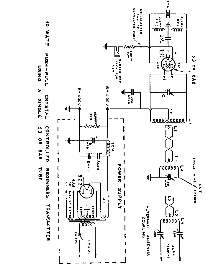 For 80 meters, L1 is 51 turns of #22 DSC or DCC (Double Silk Covered or Double Cotton Covered) wire, close wound, on a 1 1/2" diameter form, with the center-tap (CT) at turn #26. For 40 meters, L1 is 25 turns of #16 enameled wire, space-wound, on a 1 1/2" diameter form, with the CT at turn #13. C is a 50 pfd wide-spaced tuning capacitor. Since neither DCC or DSC wire are easily available any more, use vinyl-covered solid hook-up wire instead. 1 1/4" PVC plumbing pipe is a little over 1 1/2" outside diameter, and will work quite well in this rig. L2 is a one or two turn link wound over the CENTER (the "cold-end") of L1. I would use a very short piece of PVC large enough to fit over L1 as the coil form for L2 and L3, and cement it in place. I would make my links out of #16 solid wire. L2 and L3 are connected together by a "twisted-pair". Twisted zip-cord, with 4 to 8 twists per foot, would work quite well here. L4 is a coil of the same dimensions as L1, but without the CT. L3 must go over the "cold-end" of L4. If you are using an end-fed wire antenna, the cold-end of L4 will be the grounded end. For the Zepp, the "cold-end" is the center of the coil.